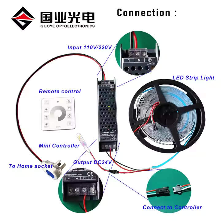 Potwierdź napięcie (takie jak 12 V lub 24 V), zasilanie (zasilanie na metr) i długość paska światła oraz wybierz odpowiedni zasilacz zgodnie z mocą paska światła. Na przykład, jeśli moc na metr paska lampy wynosi 10 W, a długość 10 metrów, całkowita moc wynosi 100 W, a zasilanie zasilania powinno być większe lub równe 100 W.